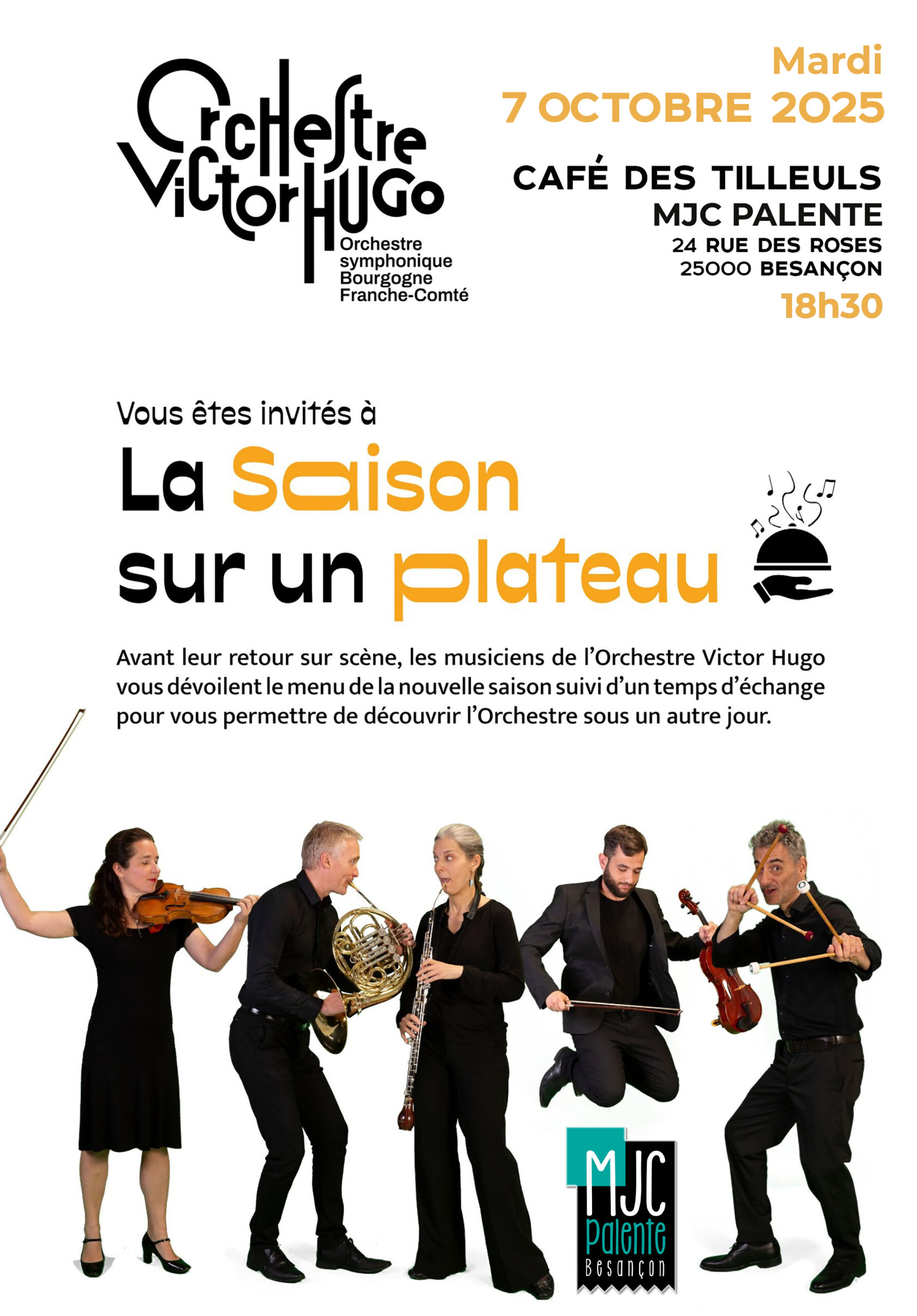 Venez rencontrer une équipe de l’Orchestre Victor Hugo au Café des Tilleuls, dans les locaux de la MJC Palente, mardi 7 octobre à 18h30.