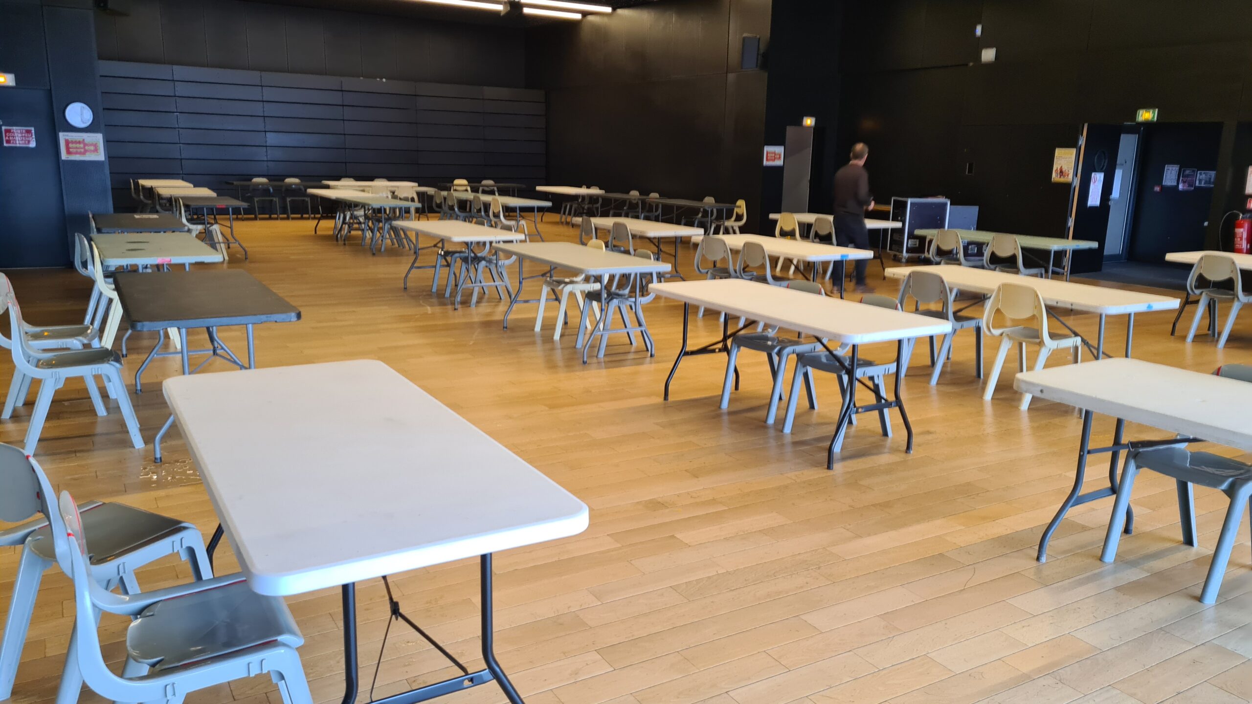 Ci-dessous, quelques photos de l’événement : l’installation des salles le samedi, le début de la journée du dimanche avec l’arrivée et l’installation des exposants, le déroulement de la journée dans les différentes salles et le hall.